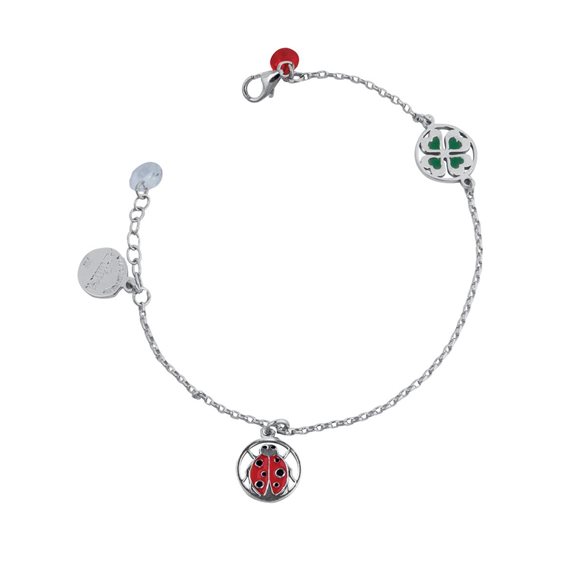BRACCIALE ARTLINEA IN ARGENTO CON COCCINELLA PENDENTE E QUADRIFOGLIO CM15,5 PIù CM3 CATENA DI ALLUNGO