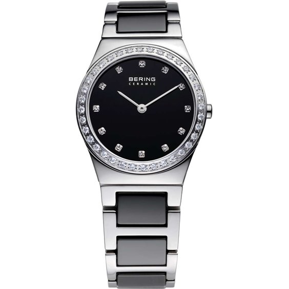 Orologio Solo Tempo Da Donna Di Bering Della Collezione Ceramic. Orologio Con Cassa Della Dimensione Di 30 Mm, Di Colore Argento Brillante E Realizzata In Acciaio Inox. Modello Con Cinturino Di Colore Argentato, Realizzato In Acciaio Inox, Con Maglie Con Dettagli In Ceramica Di Colore Nero, E Chiusura Butterfly. Questo Orologio Ha Quadrante Nero, Con Vetro Zaffiro. Modello Con Movimento Al Quarzo E Resistenza All'Acqua Di 5 Atm.