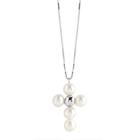 COLLANA BLISS IN ORO BIANCO KT 18 CON PENDENTE CROCE IN PERLE BIANCHE ACQUA DOLCE MM 5.