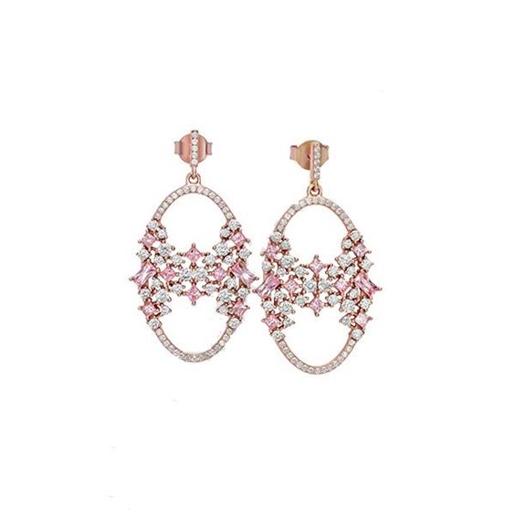 Orecchini BLISS in argento laminato rosè, con zirconi bianchi taglio brillante e zirconi rosa taglio princess e baguette. Chiusura a farfallina.