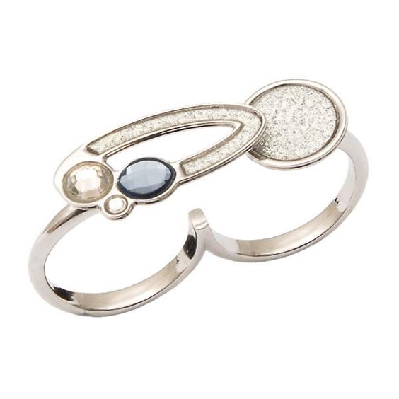 Anello aperto doppio in bronzo rodiato, con superfici glitterate e cristalli Swarovski crystal, silver night e blu shade. Regolabile fino a 2 misure in aumento o in diminuzione.