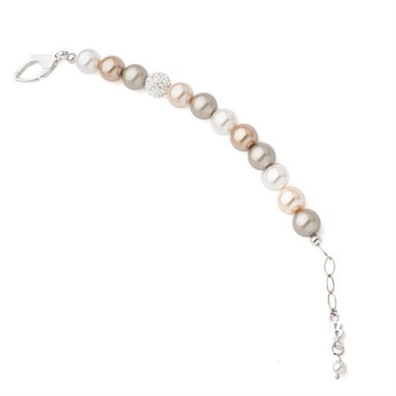 Bracciale di perle swarovski garantite, color beige,bianche e grigie di diametro millimetri 12.all'interno una boule di cristalli swarovski bianchi. Chiusura e anellini finali per regolazione misura da cm.19 a cm.22 in argento rodiato.