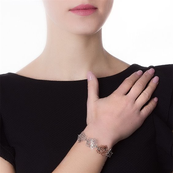 BRACCIALE HEMEROCALLIS composto da cinque elementi con lavorazione a traforo floreale in argento rodiato e uno in argento placcato oro rosa. LUNGHEZZA: cm 19 accorciabile grazie ad anellini finali fino a cm 16. DIMENSIONI: ELEMENTI FLOREALI diametro cm 2.