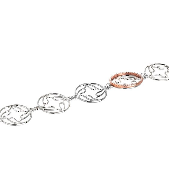 Bracciale modulare in bronzo rodiato con elementi decorativi circolari dal motivo celtico e zirconi bianchi su pavé placcato oro rosa. Lunghezza cm 17,5, estendibile fino a cm 21.
