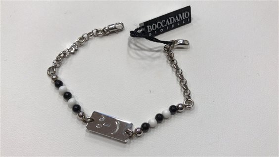 BRACCIALE BOCCADAMO UOMO IN ARGENTO CON PALLINE BIANCHE E NERE E TARGHETTA CENTRALE,CHIUSURA MOSCHETTONE.