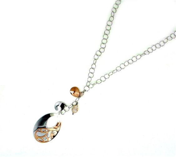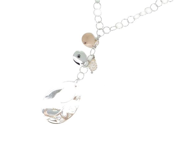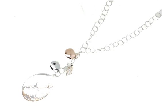 Collana maglia rolò in argento 925 lunghezza cm 46 regolabili a piacere, sottoposta a trattamento antiossidante e anallergico.Impreziosita da un ciondolo centrale in argento bianco /rosa e goccie di cristalli Swarovski color crema.