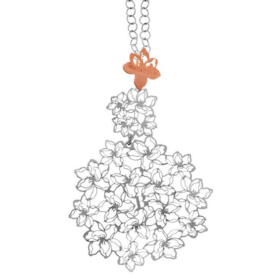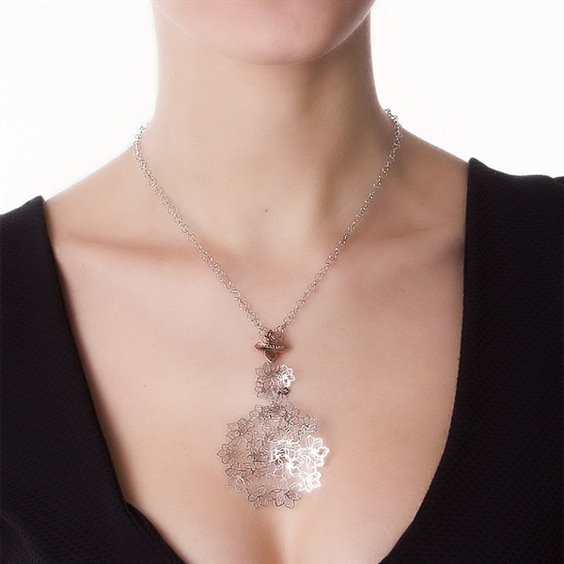 COLLEZIONE HEMEROCALLIS collana in argento rodiato con pendente lavorato al traforo con disegno floreale. Passante in argento placcato in oro rosa. LUNGHEZZA : cm 51 regolabile a piacere fino a cm 38.