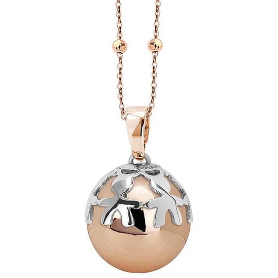 Collana Da Donna Di Boccadamo Della Collezione Angelomio Della Linea Mya. Collana In Bronzo Placcato Oro Rosa Con Ciondolo Sonoro E Coppetta Rodiata, Decorata Con Bimbi. Gioiello Con Duplice Indosso: 1 Filo - Cm 100 / 2 Fili - Cm 50.