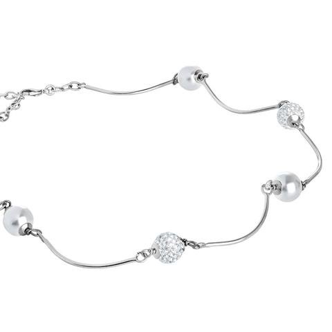 Collana tubolare in bronzo rodiato con perle bianche Swarovski (diametro mm 10) e boules di strass. Lunghezza cm 38, estendibile fino a cm 43.