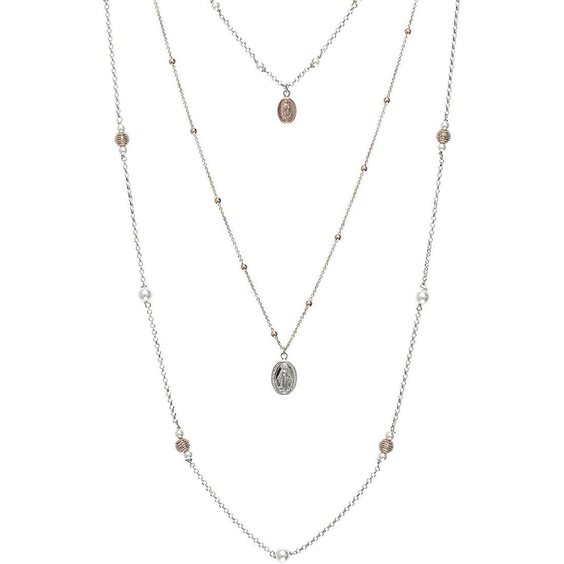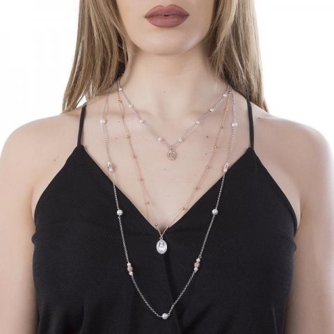 Collana Da Donna Di Boccadamo Della Linea Mediterranea Della Collezione Gratia. Collana Multifilo In Bronzo Rodiato E Placcato Oro Rosa Con Perle Bianche Swarovski Con Un Diametro Di Mm 4 E Mm 6, Medagliette Sacre Di Dimensione Mm 12X8; Mm 15X10 E Sfere Diamantate Placcate Oro Rosa Con Un Diametro Di Mm 6, La Lunghezza È Di Filo Più Corto Cm 45; Lunghezza Filo Più Lungo Cm 90 E Allungamento Di Cm 5,5. La Referenza È Xgr311 Questo collana verrà spedito con Scatola Originale Boccadamo