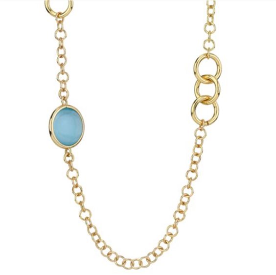 Collana placcata oro giallo con cristalli effetto cabochon di colore celeste e moduli circolari lisci e martellati. Materiale: bronzo Produzione: realizzato in Italia Misure: lunghezza cm 94 Dimensione: cristalli cm 1,5; moduli cm 1,5 Chiusura: con moschettone