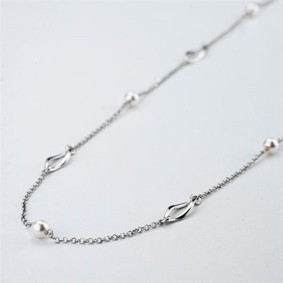 XGR763 Collana Boccadamo lunga con perle e profili a forma di foglie con effetto torchon. Collana lunga in bronzo rodiato con pendente composto da perle alternate a moduli dalla forma ovoidale e medaglietta circolare con logo traforato, sigillo di autenticità a cura del dettaglio. Materiale: bronzo Produzione: realizzato in Italia Misure: lunghezza cm 90; Dimensione: perle mm 6; moduli cm 1x0,5 Chiusura: con moschettone
