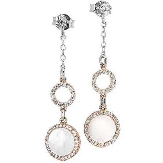 Orecchini pendenti con cerchi di zirconi e madreperla Orecchini pendenti in argento rodiato dal perno a farfalla con zircone ed elementi circolari dal profilo in zirconi (diametro mm 7) ed elemento finale in madreperla (diametro cm 1). Lunghezza cm 3,5. Chiusura con farfallina