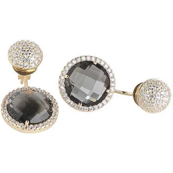 Orecchini Da Donna Di Boccadamo Della Linea Mediterranea Della Collezione Sharada. Orecchini Reversibili In Bronzo Placcato Oro Giallo Con Coppetta Zirconata Con Un Diametro Di 0,9 Cm E Cristalli Briolette Smoky Quartz E Zirconi Con Un Diametro Di Cm 1,5, La Lunghezza È Di Cm 3. La Referenza È Xor261D Questo orecchini verrà spedito con Scatola Originale Boccadamo