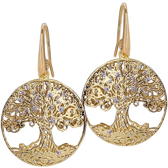 Orecchini dal gancio monachella in bronzo placcato oro giallo, Con Pendenti Circolari Del Diametro Cm 2,5 e Albero Della Vita In Glitter silver, realizzato in elettrofusione. Lunghezza Cm 4,3.