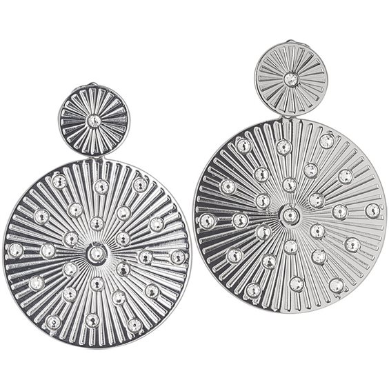 Orecchini Da Donna Di Boccadamo Della Collezione Maya Della Linea Mediterranea. Orecchini In Bronzo Rodiato Dal Perno A Farfalla E Contromaglia Circolare Con Raggi E Cristallo Swarovski Di Colore Crystal Centrale Del Diametro Cm 1,2 E Pendente Circolare Del Diametro Cm 3,5 Con Decoro Radiale E Cristalli Swarovski Di Colore Crystal. Lunghezza Cm 4,5. La Referenza È Xor444