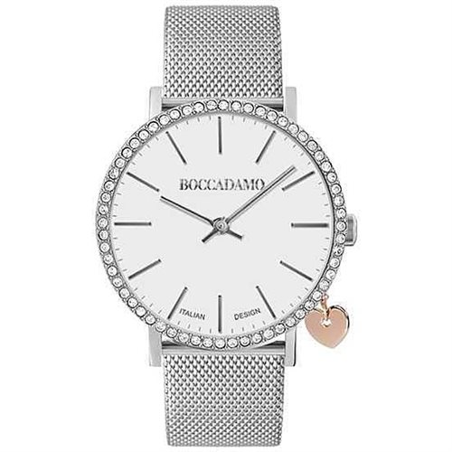 Orologio da polso da donna con quadrante circolare bianco, cassa silver ricoperta di Swarovski, charm laterale rosato a forma di cuore e cinturino in acciaio. Cassa: metallo. Cinturino: 18 mm in acciaio. Diametro cassa: 37 mm. Vetro: minerale. Movimento: al quarzo Miyota Citizen. Impermeabile all'acqua.