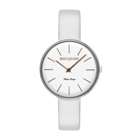 Orologio da polso da donna con quadrante circolare bianco, indici placcati oro rosa, cinturino in vera pelle bianco. Cassa e fondello: metallo e acciaio. Ansa cinturino: 10 mm. Lunghezza cinturino: 22 cm. Diametro cassa: 28 mm. Vetro: minerale. Movimento: Miyota 2025. Resistente all'acqua.