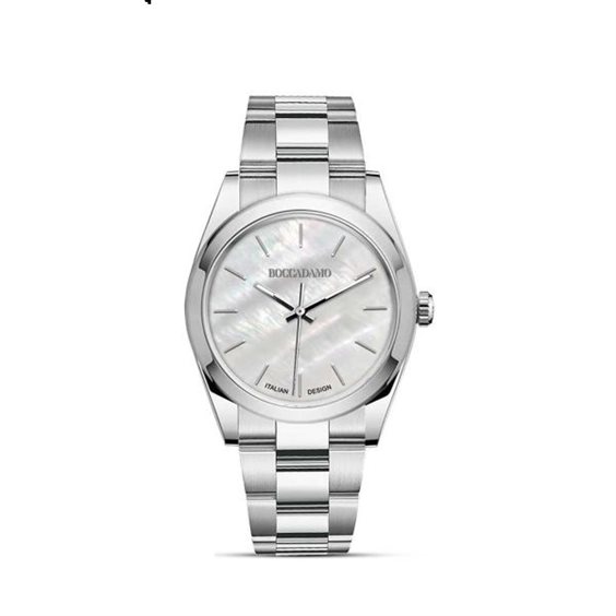 Cassa e fondello: acciaio Ansa cinturino: 18 mm Lunghezza cinturino: a maglie regolabili Diametro cassa: 35 mm Vetro: minerale Chiusura bracciale: deployant Movimento: al quarzo Miyota 2035 Resistente all'acqua 5 ATM Orologio solo tempo donna con quadrante in madreperla e bracciale Oyster in acciaio Solid silver.