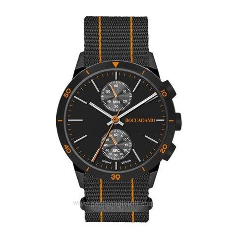Orologio uomo boccadamo, nv013, collezione navy, crono con quadrante circolare nero, cassa nera e cinturino in nylon neroearancioneedizionenumerataperiprimi500esemplari. cassa: acciaio. corona e fondello: serrati a vite. cinturino: 22 mm in nylon. diametro cassa: 42, 5 mm. vetro: minerale. movimento: al quarzo miyota citizen. impermeabilità: 5 atm. Principali caratteristiche: Cinturino Nylon