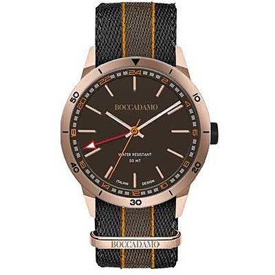 Orologio Solo Tempo Da Uomo Di Boccadamo Della Linea Time, Collezione Navy. Orologio Con Quadrante Circolare Marrone, Cassa Rosata, Cinturino In Nylon Nero, Marrone Ed Arancione. Edizione Numerata Per I Primi 500 Esemplari. Cassa: Acciaio Corona E Fondello Serrati A Vite. Cinturino Della Larghezza Di 22 Mm In Nylon, Diametro Della Cassa Di 42 Mm E Vetro Minerale. Orologio Con Movimento Al Quarzo Ronda Svizzero E Resistenza All'Acqua Di 5 Atm. La Referenza È Nv019 Questo solo tempo verrà spedito con Scatola Originale Boccadamo