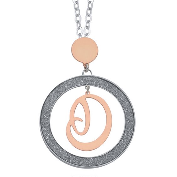Collana in bronzo rodiato, contromaglia a contrasto e pendente piccolo glitterato (diametro cm 4) con lettera D corsiva placcata oro rosa. Duplice indosso: 1 filo cm 80 / 2 fili cm 40.