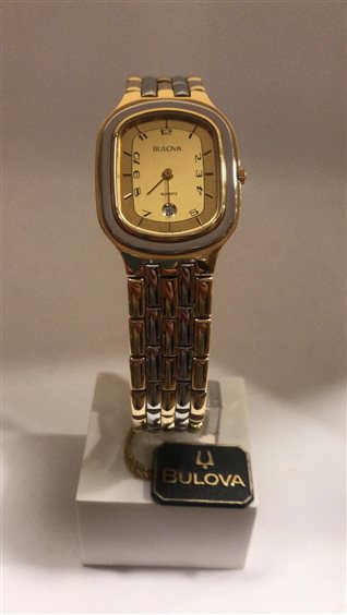 OROLOGIO BULOVA CASSA E CINTURINO IN ACCIAIO QUADRANTE FONDO DORATO SOLO TEMPO DATARIO POSIZIONATO AL NUMERO 6 CHIUSURA DEPLOYANTE.