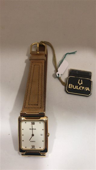 OROLOGIO BULOVA CASSA IN ACCIAIO DORATO QUADRANTE RETTANGOLARE FONDO BIANCO SOLO TEMPO CON DATARIO SUL NUMERO 3 CINTURINO PELLE CHIUSURA ARDIGLIONE IN ACCIAIO DORATO.