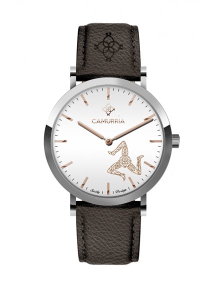 A Trinacria, della collezione 'A Tradizione, presenta l'orologio Vanity con cassa in acciaio e cinturino in pelle. La stampa della Trinacria, tipica siciliana, è riportata su un orologio dal design unico ed originale.