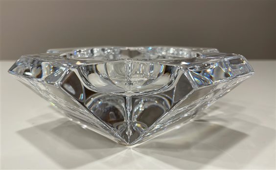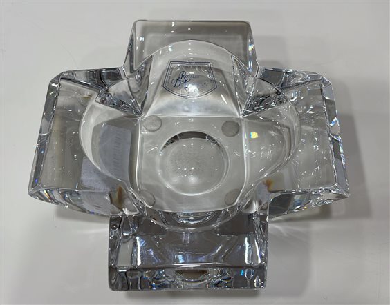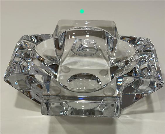 Posacenere Royale de Champagne in cristallo trasparente dalla forma quadrangolare e dalle linee moderne. La "Cristallerie Royale de Champagne-BAYEL" è uno dei più antichi produttori francesi di cristalli soffiati a bocca. Questa fabbrica di cristalli di fama mondiale non ha mai spento i suoi forni dal 17° secolo. La Royale de Champagne di oggi è l'erede di alcuni dei saperi più ricchi e raffinati dove la mano dell'uomo è sovrana. Soffiatura a bocca, taglio a mano, incisione a sabbia, satinatura, doratura, deposizione di platino, smaltatura, sono tutti tributi ai mestieri del fuoco che hanno fatto la reputazione di Bayel e le hanno permesso di ottenere l'etichetta Living Heritage Company.