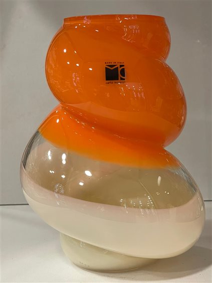 VASO PAGUR DI CARLO MORETTI DELLA COLLEZIONE IPICCOLI 269/333 DELLA COLLEZIONE VASI 2006. I COLORI DEL VASO SONO ARANCIO E PANNA, HA UNA FORMA ASIMMETRICA E SINUOSA, DALLE LINEE MODERNE. Carlo Moretti è una “fabbrica degli originali” fondata nel 1958 da Carlo e Giovanni Moretti che ha sede nell'isola di Murano, nel cuore della laguna di Venezia. La loro produzione, dallo stile originale e inconfondibile, testimonia l'incontro tra la secolare tradizione dei maestri vetrai e un pensiero progettuale tra i più autentici nello scenario del design italiano contemporaneo. I loro oggetti sono prodotti in numero limitato, realizzati in Cristallo di Murano, soffiati a bocca, firmati e rifiniti a mano.