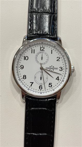 OROLOGIO CHRONOSTAR UOMO CASSA ACCIAIO QUADRANTE FONDO BIANCO SOLO TEMPO CON CINTURINO PELLE NERO CHIUSURA ARDIGLIONE IN ACCIAIO.