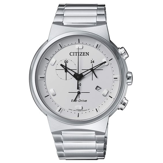 Orologio uomo con cronografo, cassa e bracciale in acciaio, vetro zaffiro, movimento Eco Drive con riserva di carica 5 mesi, impermeabile 10 bar (100 metri)