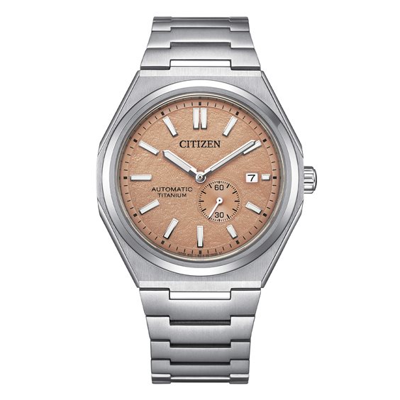 Orologio Uomo Automatico solo tempo Citizen modello Automatico Super Titanio. Cassa e bracciale realizzati in titanio Grado 2 lavorato con la tecnologia esclusiva Citizen Duratec che conferisce un elevato livello di finitura estetica attraverso l’alternanza di superfici lucide e spazzolate e al tempo stesso ne incrementa la resistenza all’abrasione di oltre 5 volte rispetto all’acciaio inox. Movimento Citizen meccanico a ricarica automatica con 21 rubini, 21600 alternanze e 42 ore riserva di carica. Indicazione di ore, minuti, secondo (su contatore separato a ore 5). Vetro Zaffiro antigraffio. Quadrante colore Salmone con pattern materico ispirato alla granulometria tipica del titanio, indici e lancette luminescenti, data ore 3. Bracciale regolabile in Super titanio satinato e lucido, chiusura deployante con pulsanti. Impermeabile 10 atm. Scatola e Libretto con Garanzia 5 anni originali.