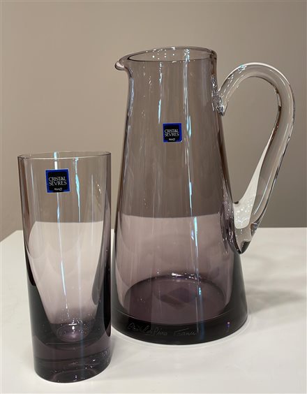 BROCCA BIARRITZ DELLA CRISTAL SEVRES GLICINE DALLA FORMA CONICA CON 6 BICCHIERI BIBITA GLICINE. BROCCA: 12.5x23.5 cm BICCHIERE: 5.5x15 cm GIÀ NEL 1762 LA VETRERIA DI SEVRES FU CONSIDERATA UNA DELLE TRE MIGLIORI FORNACI DI FRANCIA. E’ IL MARCHESE DI MARIGNY CHE INTRODUCE IL CRISTALLO NELLA PRODUZIONE DI SEVRES E CONVERTE L’ EUROPA ALLA TRASPARENZA INEGUAGLIABILE DI UN MATERIALE CHE DIVENTA ORMAI NECESSARIO A TUTTE LE GRANDI TAVOLE. IN UN SECOLO E MEZZO CRISTAL DE SEVRES CONQUISTA GLI APPASSIONATI DELL’ ARTE E DELLA TAVOLA PARTICOLARMENTE INTRANSIGENTI SULLA QUALITÀ E NELL’ ESTETICA. OGGI CRISTAL SEVRES CONIUGA LA PERFEZIONE ARTIGIANALE DEL ‘FATTO A MANO E LA SENSIBILITÀ CREATIVA AL PUNTO CHE MOLTI DEI MAESTRI VETRAI CHE LAVORANO IN SEVRES HANNO RICEVUTO IL PRESTIGIOSO TITOLO DI ‘MEILLEUR OUVRIER DE FRANCE’.