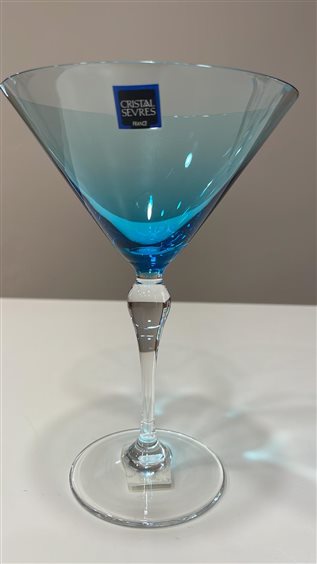 2 COPPE MARTINI FIRMATE CRISTAL SEVRES DELLA COLLEZIONE POILLY IN CRISTALLO TURCHESE. GIÀ NEL 1762 LA VETRERIA DI SEVRES FU CONSIDERATA UNA DELLE TRE MIGLIORI FORNACI DI FRANCIA. E’ IL MARCHESE DI MARIGNY CHE INTRODUCE IL CRISTALLO NELLA PRODUZIONE DI SEVRES E CONVERTE L’ EUROPA ALLA TRASPARENZA INEGUAGLIABILE DI UN MATERIALE CHE DIVENTA ORMAI NECESSARIO A TUTTE LE GRANDI TAVOLE. IN UN SECOLO E MEZZO CRISTAL DE SEVRES CONQUISTA GLI APPASSIONATI DELL’ ARTE E DELLA TAVOLA PARTICOLARMENTE INTRANSIGENTI SULLA QUALITÀ E NELL’ ESTETICA. OGGI CRISTAL SEVRES CONIUGA LA PERFEZIONE ARTIGIANALE DEL ‘FATTO A MANO E LA SENSIBILITÀ CREATIVA AL PUNTO CHE MOLTI DEI MAESTRI VETRAI CHE LAVORANO IN SEVRES HANNO RICEVUTO IL PRESTIGIOSO TITOLO DI ‘MEILLEUR OUVRIER DE FRANCE’.