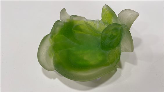 Scultura Daum piccola coppetta di orchidea verde chiaro in patè de verre con sfumature bianco trasparente sui bordi. Daum è stata una cristalleria di Nancy in Francia, fondata nel 1878 da Jean Daum. Attualmente questo marchio indica oggetti artistici in cristallo, prodotti con l'impiego di pasta di vetro (patè de verre), una tecnica di fusione in uno stampo refrattario con successiva cottura in forno. Ogni pezzo Daum è unico e rappresenta un'opera d'arte tra le sculture contemporanee.