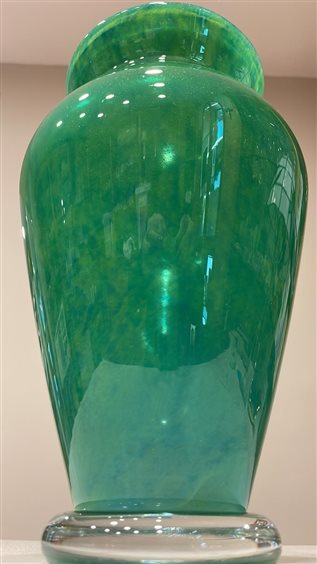 Vaso Daum in cristallo verde con sfumature azzurre e gialle. Daum è stata una cristalleria di Nancy in Francia, fondata nel 1878 da Jean Daum. Attualmente questo marchio indica oggetti artistici in cristallo, prodotti con l'impiego di pasta di vetro (patè de verre), una tecnica di fusione in uno stampo refrattario con successiva cottura in forno. Ogni pezzo Daum è unico e rappresenta un'opera d'arte tra le sculture contemporanee.