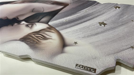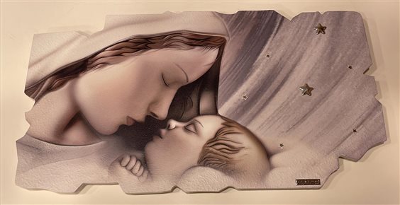 CAPEZZALE ESTEGO IN LEGNO CON BORDI SEGHETTATI RAFFIGURANTE LA MATERNITA'CON STELLE IN ARGENTO. ESTEGO srl nasce nel 2011 dalla trentennale esperienza di Gilberto Sturba, specialista nel settore della produzione e della commercializzazione di articoli da regalo e di immagini sacre. L’azienda ha l’obiettivo di presentare ad un pubblico sempre più esigente articoli di eccellenza, caratterizzati dal design italiano e realizzati con sapiente manualità artigiana. Le collezioni Estego, prodotte con materiali di alta qualità e accuratamente rifinite, si contraddistinguono per l’eleganza e lo stile inconfondibile dei prodotti “Made in Italy”.
