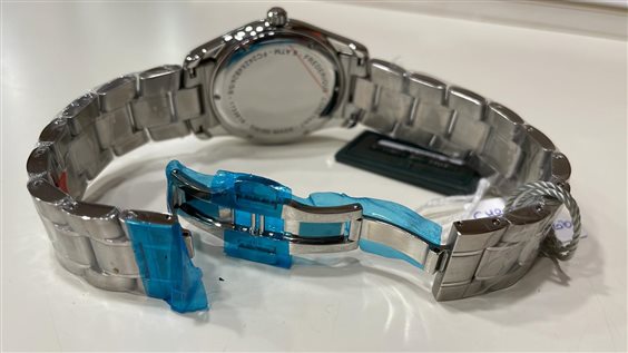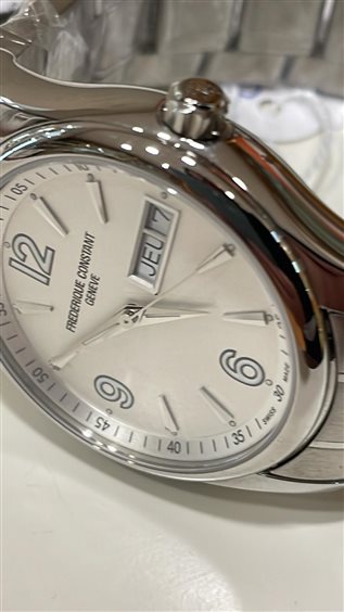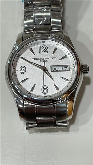 Orologio Frederique Constante Junior Day-Date con cassa e cinturino in acciao con chiusura a doppia deployante e quadrante fondo argento con datario posizionato al numero 3 e numeri arabi presenti sul quadrante. Impermeabilità dell'orologo 6 ATM.