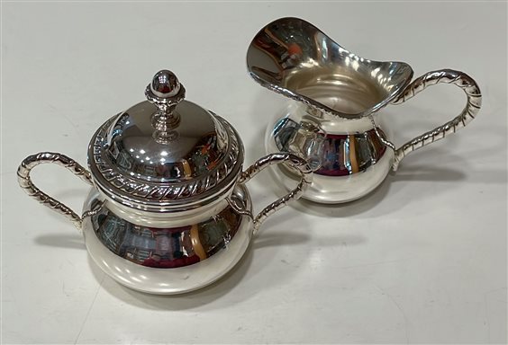 PREGIATO PEZZO D'ARGENTERIA. L'ALTA QUALITA' DEI MATERIALI E DELLA LAVORAZIONE SONO GARANTITI DAI MARCHI LEGALI IMPRESSI SUL PEZZO. SET LATTIERA E ZUCCHERIERA GREGGIO IN ARGENTO MASSICCIO 800, SUPERFICIE LISCIA E LUCIDA E BORDO LAVORATOZUCCHERIERA: 10x10cm LATTIERA: 7x9.5cm