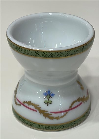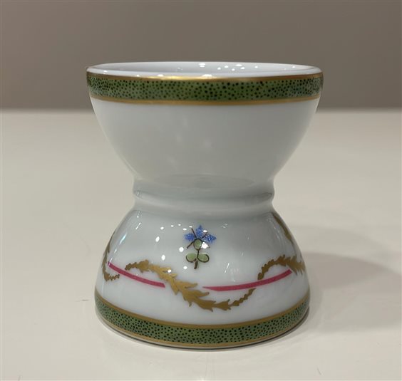 Haviland, da oltre un secolo e mezzo, conferma la sua leadership sul mondo della porcellana francese. Il successo della porcellana Haviland passa attraverso la seduzione che ha saputo suscitare. Le più grandi corti del mondo, i più grandi capi di stato non hanno potuto, neppure loro, resistere all'attrattiva di questa porcellana d'eccezione. PORTAUOVO HAVILAND IN PORCELLANA LIMOGES DELLA COLLEZIONE "Vieux Paris Vert" CON MOTIVI FLOREALI E DECORI IN ORO. Negli anni '60, negli archivi di Haviland è stato trovato un modello di Rouart chiamato "Vieux Paris", risalente al 1911. È stato quindi scelto per essere riprodotto dal produttore. Il motivo di questa collezione è tipico delle preferenze di Maria Antonietta. Questo servizio è simile a quello di un design creato dalla Manifattura di Sèvres risalente al 18° secolo. Fiordalisi in blu, viola e oro accentuano il medaglione a corona d'alloro che circonda un delicato bouquet di fiori. La collezione Vieux Paris Vert aggiungerà un tocco di eleganza alle vostre tavole più raffinate.