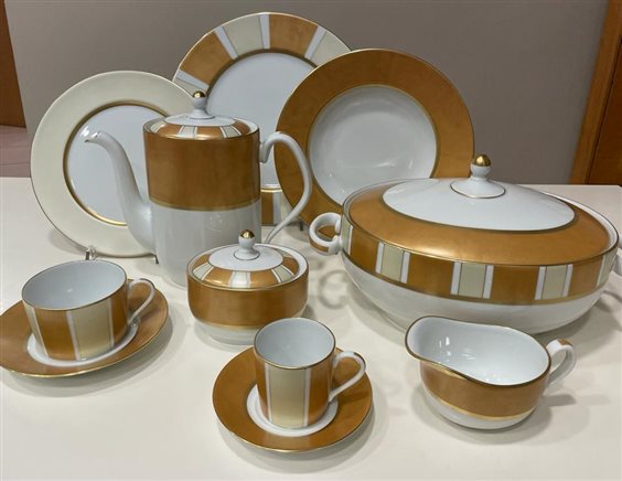 Haviland, da oltre un secolo e mezzo, conferma la sua leadership sul mondo della porcellana francese. Il successo della porcellana Haviland passa attraverso la seduzione che ha saputo suscitare. Le più grandi corti del mondo, i più grandi capi di stato non hanno potuto, neppure loro, resistere all'attrattiva di questa porcellana d'eccezione. SERVIZIO PIATTI HAVILAND SERENGETI IN PORCELLANA LIMOGES BIANCO CON DECORI ORO COMPOSTO DA 62 PEZZI DI CUI SERVIZIO TAVOLA 41 PEZZI: -12 PIATTI PIANI (28cm) -12 PIATTI FONDI (24cm) -12 PIATTI FRUTTA (22cm) -1 ZUPPIERA (h16cm x 30cm) -1 RAVIERA (23.5cm) -1 INSALATIERA (24.5cm) -1 PIATTO TONDO (31.5cm) -1 PIATTO OVALE (40cm) SERVIZIO CAFFE' 15 PEZZI: -1 CAFFETTIERA (h20cm x 23cm) -1 ZUCCHERIERA (h9.5cm x 11.5cm) -1 LATTIERA (h6cm x 13cm) -12 TAZZE CAFFE'(h6cm) CON PIATTINO (12cm) SERVIZIO THE 6 PEZZI: 6 TAZZE THE (h5.5cm) CON PIATTINO (14.5cm)