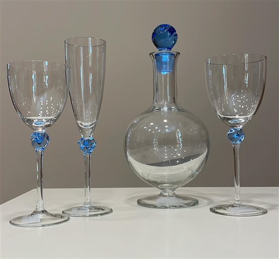 SERVIZIO BICCHIERE ICHENDORF JAY COMPOSTO DA 37 PEZZI, 1 BOTTIGLIA, 12 FLUTE, 12 VINO E 12 ACQUA. CRISTALLO TRASPARENTE CON DECORI AZZURRI. BOTTIGLIA: H27.5CM FLUTE: H23CM VINO: H19CM ACQUA: H20CM ICHENDORF, DA OLTRE CINQUANT’ANNI, PORTA NELLE CASE TUTTA LA MAGIA DELLE PIÙ RICERCATE TECNICHE DI LAVORAZIONE DEL VETRO, NEL NOME DI UNA INTRAMONTABILE TRADIZIONE. LA STRETTA COLLABORAZIONE DEI DESIGNER CON I MAESTRI VETRAI, MOSTRA LA CURA ARTIGIANALE DELL’AZIENDA PER LA QUALE L’ESSENZIALITÀ DELLA FORMA E LA PUREZZA DEL MATERIALE RAPPRESENTA LA FILOSOFIA PROGETTUALE E PRODUTTIVA.