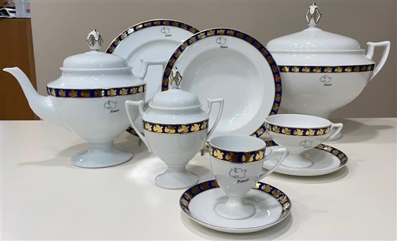 SERVIZIO PIATTI IN PORCELLANA BAVARIA BIANCO CON DECORI ORO E BLU. E' UN OMAGGIO ALLA COLLEZIONE DI PABLO PICASSO. IL SERVIZIO E' COMPOSTO DA 71 PEZZI DI CUI SERVIZIO TAVOLA 41 PEZZI: -12 PIATTI PIANI (25cm) -12 PIATTI FONDI (20cm) -12 PIATTI FRUTTA -1 ZUPPIERA (h29cm x 35cm) -1 RAVIERA -1 INSALATIERA -1 PIATTO TONDO -1 PIATTO OVALE SERVIZIO CAFFE' 15 PEZZI: -1 CAFFETTIERA (h21.5cm x 26cm) -1 ZUCCHERIERA (h16.5cm x 15cm) -1 LATTIERA -12 TAZZE CAFFE'(h8cm) CON PIATTINO (12cm) SERVIZIO THE 15 PEZZI: -1 THEIERA -1 ZUCCHERIERA -1 LATTIERA -12 TAZZE THE (h7cm) CON PIATTINO (15cm)