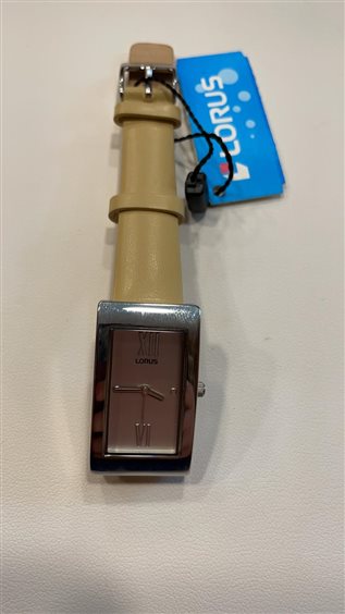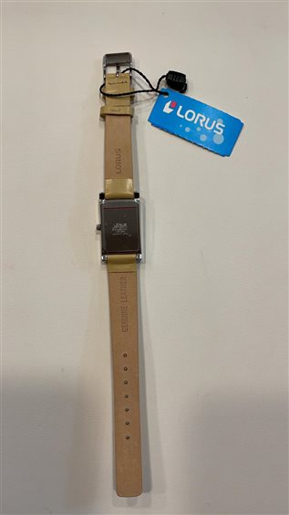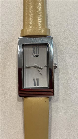 OROLOGIO LORUS DONNA CASSA IN ACCIAIO RETTANGOLARE FONDO ARGENTO SOLO TEMPO CON CINTURINO PELLE BEIGE CHIUSURA ARDIGLIONE IN ACCIAIO.