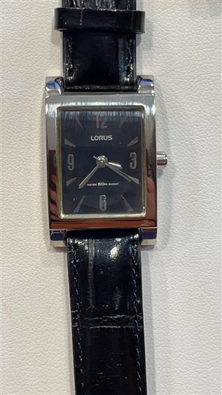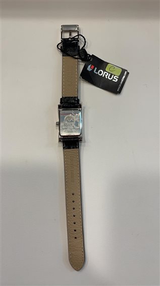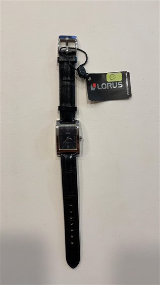 OROLOGIO LORUS DONNA CASSA IN ACCIAIO RETTANGOLARE FONDO NERO SOLO TEMPO CON CINTURINO PELLE NERO CHIUSURA ARDIGLIONE IN ACCIAIO .