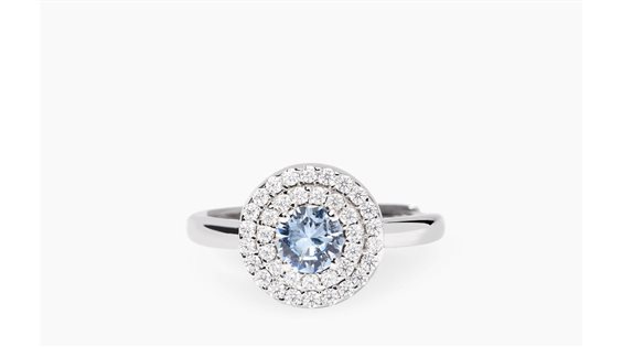 Anello in argento 925/°°° rodiato con acquamarina sintetica Ø 5 mm e zirconi Ø 1.25 mm, misura regolabile da 11 a 19