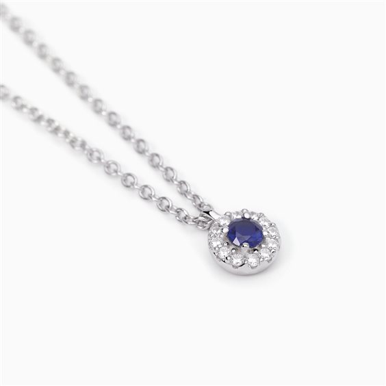 Collana in argento con catena forzatina. Ciondolo rotondo con zaffiro sintetico e zirconi. • Dimensione dello zaffiro sintetico: 3.5 mm • Dimensioni degli zirconi: 1.25 mm • Chiusura con moschettone • Misura regolabile, lunghezza da 38 a 42 cm • Materiale: Argento 925, Zaffiro sintetico, Zirconi