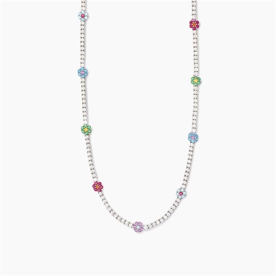 Girocollo tennis in argento 925/ººº rodiato con elementi fiore con zirconi multicolor Ø 1.75 mm e bianchi Ø 2 mm, lunghezza regolabile da 36 a 41 cm
